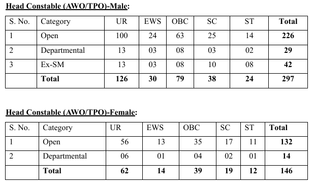Delhi Police Head Constable (AWO/TPO) Revised Vacancies